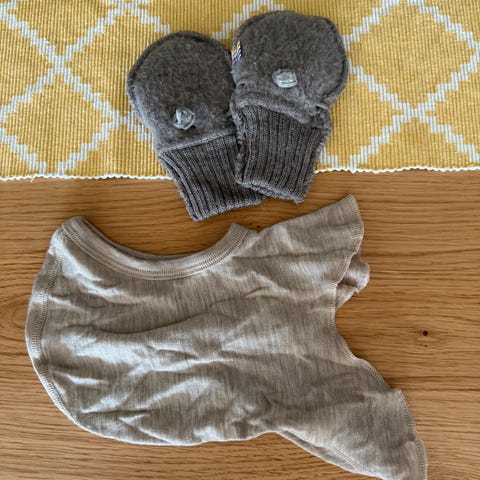 Ullvotter (90 - 100 cm) og ullsokker (90 cm) fra Joha + ullvotter fra Cubus (74/86). Godt brukt, men i god stand.