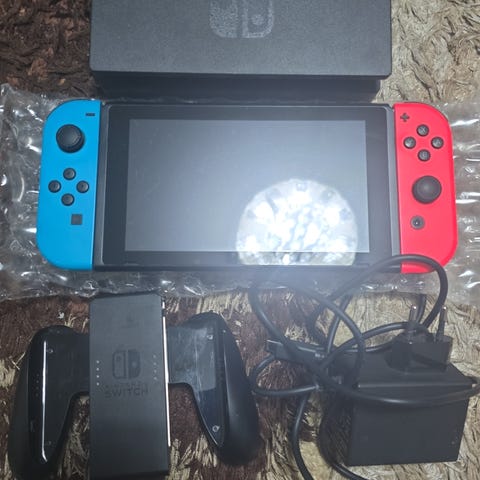 Nintendo Switch spillkonsoll med to Joy-Con kontroller i rød og blå farge, samt tilhørende dock for tilkobling til TV. Konsollen er designet for både håndholdt og stasjonær bruk.