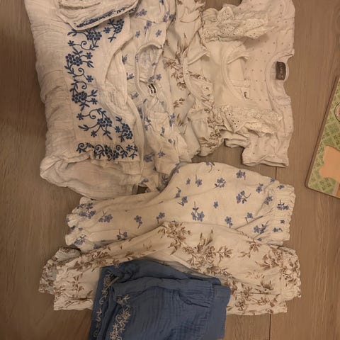 Stor klespakke i str 74 selges. Alle klærne er pent brukte av ett barn. To av tskjortene har en flekk hver (se siste bilde), mens resterende er uten bruksmerker eller slitasje.