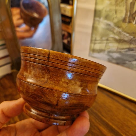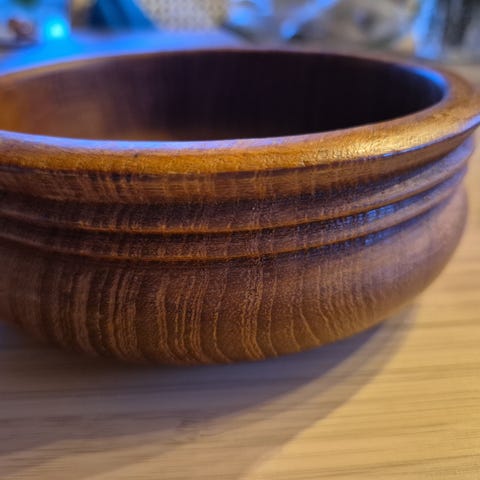 Treskål med detaljerte utskjæringer rundt kanten. Skålen har en rund form og et naturlig treutseende. Egnet til dekorasjon eller praktisk bruk.