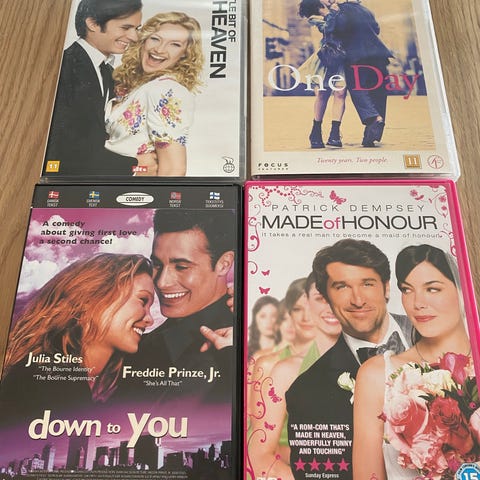 DVD-pakke, romantisk film, kjærlighetsfilm, film om relasjoner, drama, komedie, musikkfilm, film for par, brukt DVD, filmkveld, filmkupp, samler, relasjonsfilm