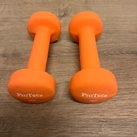 ProTec manualvekter med vekt på 1,5 kg hver. Manualene er rød og har et belegg som gir godt grep. Egnet for trening og styrkeøvelser.