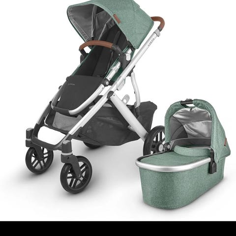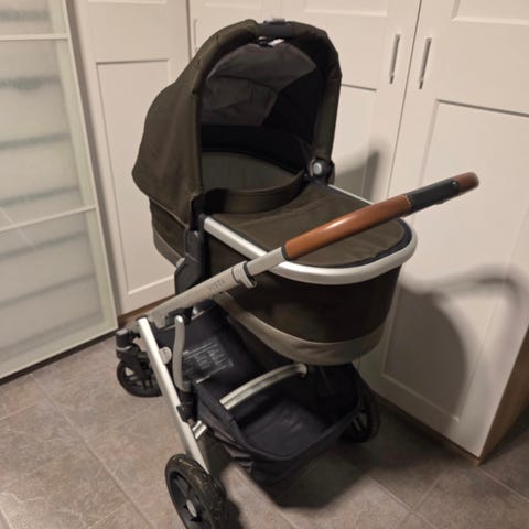 Uppababy Vista V2, kjøpt i 2023 for 14.000kr, men da komplett. Emmet green med brune skinndetaljer. Koppholder og telefonholder kan følge med om ønskelig