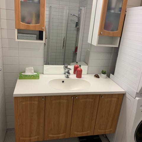 Armatur med dusjhåndtak, samt svingbar glassvegg følger med.