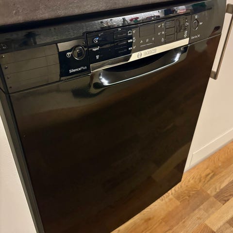 Bosch oppvaskmaskin med svart farge. Modellen har standard oppvaskmaskinfunksjoner og er designet for integrert montering under kjøkkenbenk.