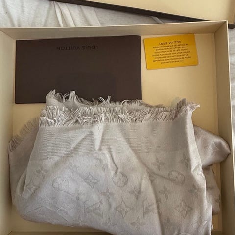 Selger et lite brukt Louis Vuitton sjal da det ikke blir brukt nok. Sjalet er ekte og kjøpt på Louis vuitton i London, kvitering medfølger ikke da den har blitt borte i forbindelse med flytting. Sjalet har en svært liten rift som ikke er synlig med mindre du vet om den. Legger ved bilde av dette. Ta gjerne kontakt ved spørsmål.