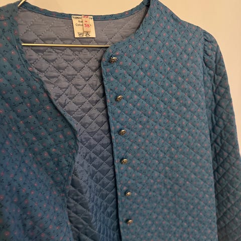 Pent brukt retro blazer i svart og blå. Str 38. 70 % viskose og 30 % polyester, innside er 100 % acetat (kunstig silke). Lommer som fortsatt er sydd igjen.