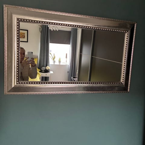 Bohus dekorasjonsornament speil med en dekorativ ramme. Speilet har detaljerte utskjæringer på rammen som gir et klassisk utseende. Rammefargen er hvit, og speilet er egnet for bruk i stue eller spisestue.