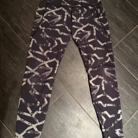Treningsbukse for dame i størrelse S med geometrisk mønster i svart, hvitt og grønt Egnet for fitnessaktiviteter.