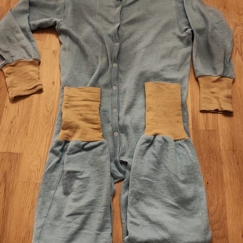 Grå/hvit trøye str 128 og blå/grå str 116. Sokker i lyng, ca str 25. Alle plaggene har små hull her og der og spesielt slitt nederst på armene. Trenger du lappetøy passer disse kanskje perfekt?