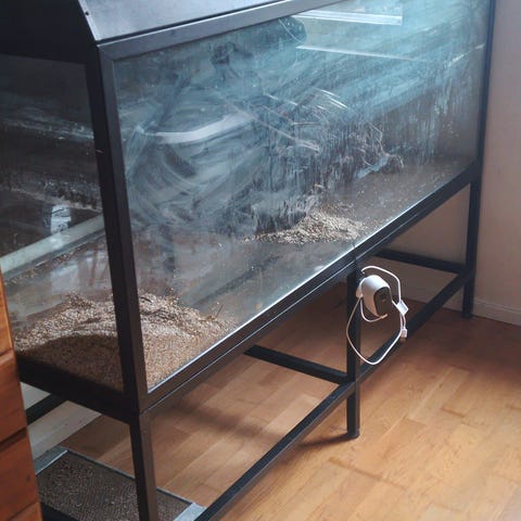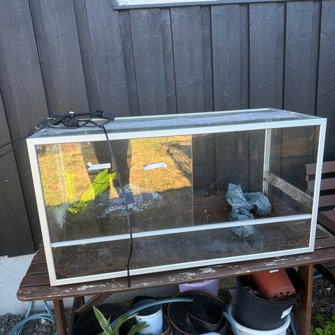 Brukt terrarie til salgs, kjøpt det brukt selv, så vet ikke alderen. Funker fjell. Beboeren har fått seg bedre tilpasset terrarie, så da er dette ledig.