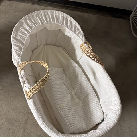 Selger denne koselige flettekurven til baby. Kjøpt brukt av en som har bygget den selv. Veldig fin soveplass for nyfødte og små spedbarn. Håndtakene gjør at det er lett å flytte med seg kurven fra rom til rom. Hjemmesydd sengekant og madrass kan medfølge om ønskelig ☺️ Må hentes på Grünerløkka i Oslo.