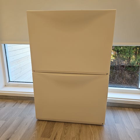Pent brukt garderobe laget i tre selges. Her kan jakker o.l henges opp og sko kan plasseres i hyllene under. Praktisk og rommer mye.