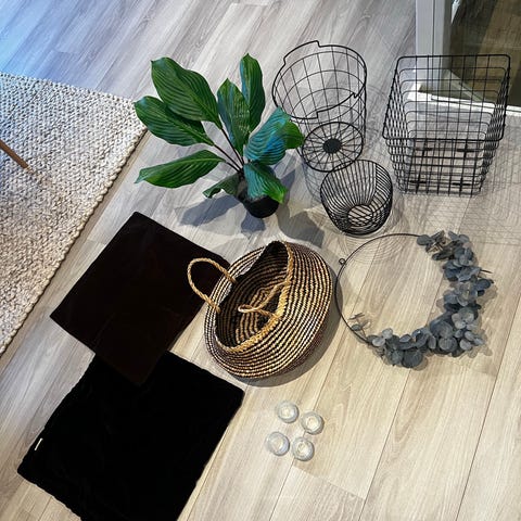 Selger en liten Interiørpakke bestående av en liten nettingkurv i gull, en lyslykt fra kid, to glassbeholdere fra ikea, en grå duk fra Hm home i str 45x150 og to grå hotellputetrekk (70x100). Må hentes Ulefoss.