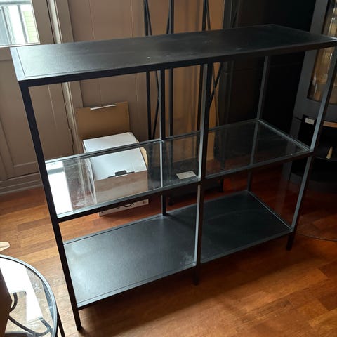 Hylle av eik med glassinnsatser selges. Ingen bruksmerker.