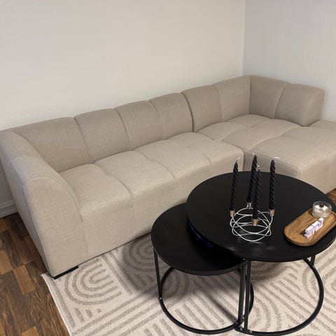 Det er en stor seksjonssofa i svart skinn, som gir rikelig med sitteplasser. Sofa er kjøpt på Bohus. Er i veldig god stand. Det er justerbare armlener og nakkestøtter for en komfortabel avslapping.