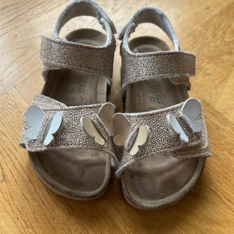 Barnesandaler for jente i størrelse 35. Sandalene har to justerbare borrelåsremmer og dekorative sommermotiver. Sålen har mønster for bedre grep. Egnet for bruk i sommerhalvåret. Brukt i 2 mnd betalte 600 for de.