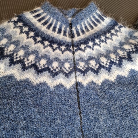 Flott og varm genser i str M/L. Helt ny. Strikket i islandsk alafosslopi i hvit/ aqua/ mørk brun.