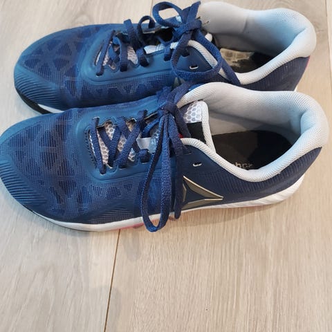 Reebok NFX Trainer treningssko i størrelse 39, designet for fitness. Skoene har en hvit overflate med rosa detaljer og er laget for å gi støtte og komfort under treningsøkter.