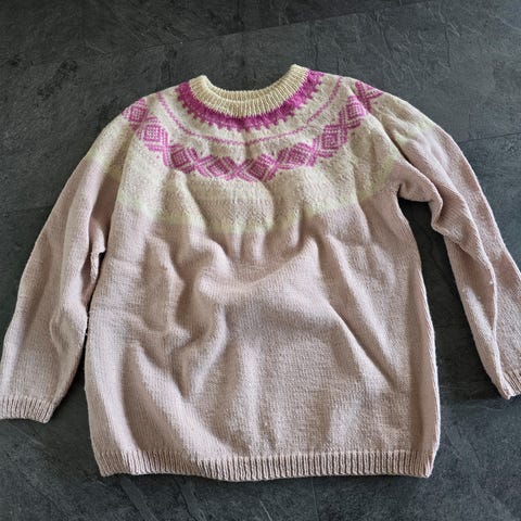 Burgunder og kvit genser. Overvidde 98, lengd 60.Lite brukt.