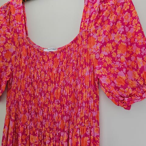 Fin sommerkjole i blomstrete brunt og grønt fra Floyd. Str. L.