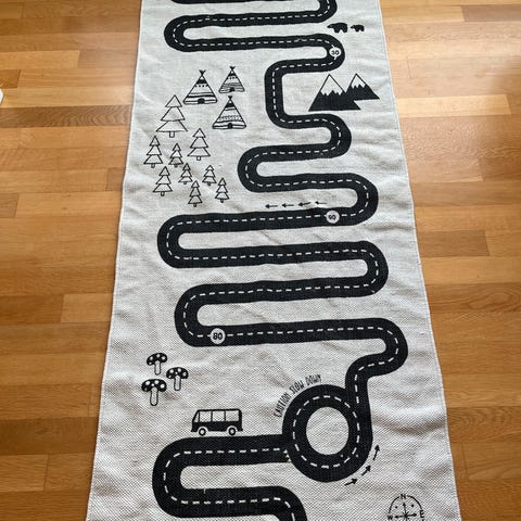 Løveteppet fra merket Oyoy, har ligget på gulvet på barnerommet i babytiden. Veldig dekorativt til barnerommet og mykt å stå på.