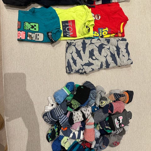 Klespakke str 116. To bukser, tre gensere, en skjorte. Den rustfarga buksa er litt nuppete, ellers strøkent.