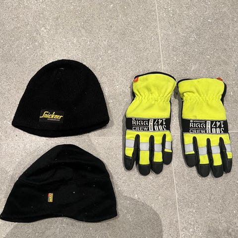 Strikket blå balaklava lue, Gode strikket sokker, Etirel varme hansker og en ubrukt stillongs i XL selges samlet.