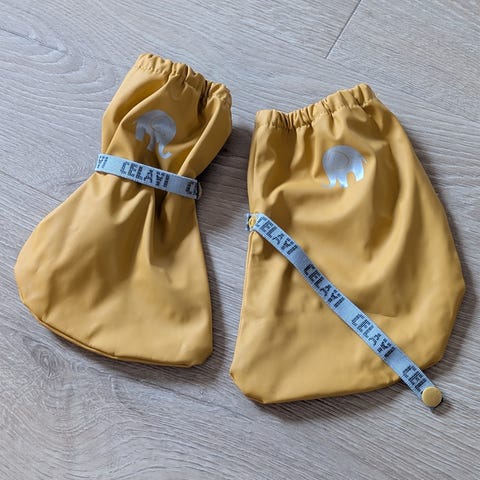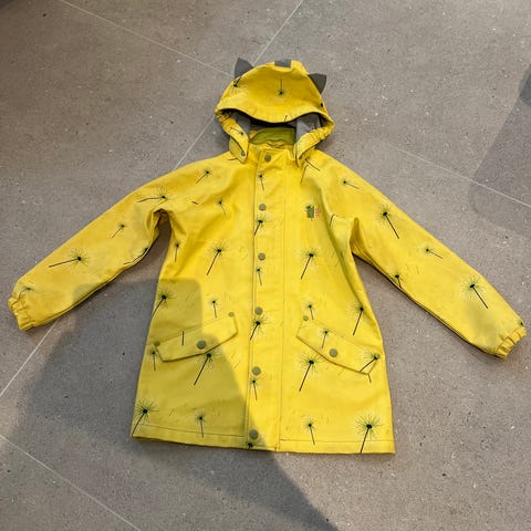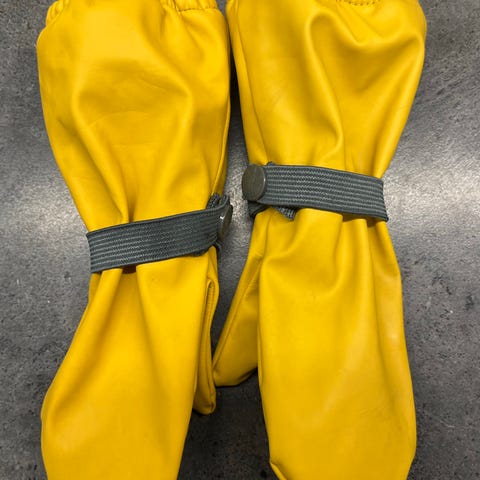 Lappen er teke av, men jenta her likte ikkje denne typen vottar så dei blei liggande ubrukt.