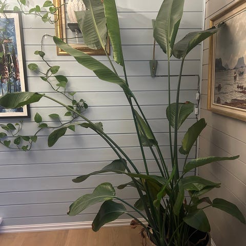 Stueplante med stor høyde og grønne blader. Egnet for innendørs bruk som dekorativ plante.