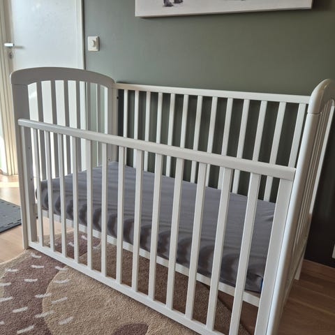 Troll Lux Sprinkelseng i hvit farge. Sengen er pent brukt. Bunnen kan festet på 3 ulike nivå. Den en langsiden kan senkes. Se bilde.