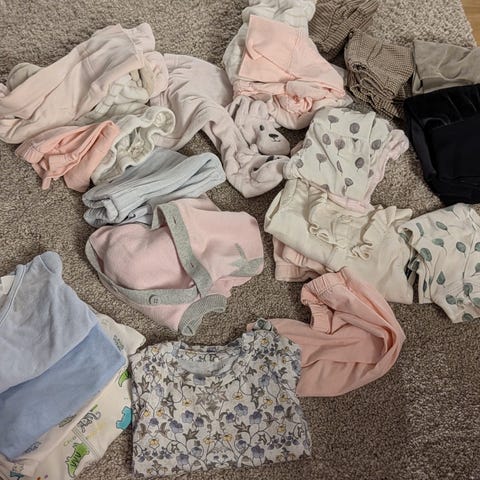 H&M og andre merker klær for jente i størrelse 74/80, hovedsakelig i rosa farge. Inneholder ulike plagg egnet for små barn, inkludert gensere, bukser, kjoler og topper i forskjellige materialer. Helt og pent brukt til ett barn