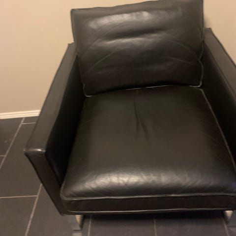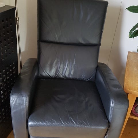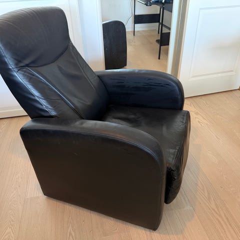 Selger en godt brukt, men fullt brukbar lenestol. Ryggen kan legges ned og stolen kan snurres.