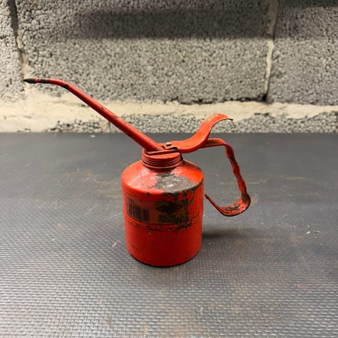 Selger en eldre oljekanne i metall, tradisjonell verkstedmodell med lang tut.