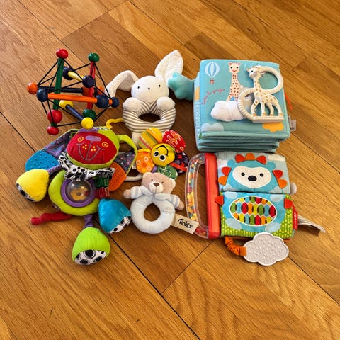 Leker for babyer i alderen 0–18 måneder, tilgjengelig i forskjellige modeller og farger. Lekene inkluderer våte klut- og plastbøker, to myke baller og to musikalske plysjleker.
