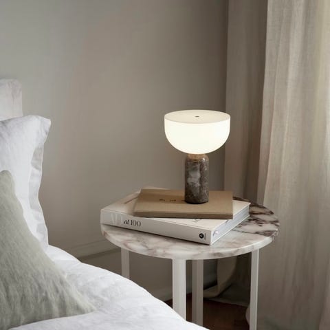 Torrano bordlampe fra Globen Lighting med en eksklusiv lampefot i naturstein, en rund lampeskjerm i opalglass og detaljer i metall.