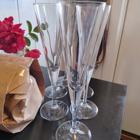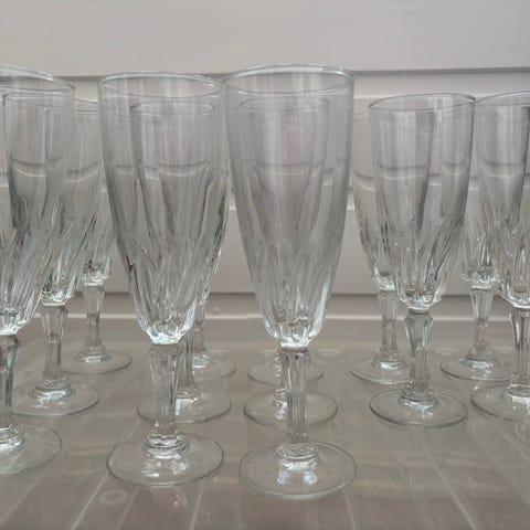 Champagneglass i krystall. Designet for servering av champagne og musserende vin. Har en stilfull stil med en rund dekorativ kule på stilken. Har 14 stk selges samlet 600 eller 75 kr pr glass