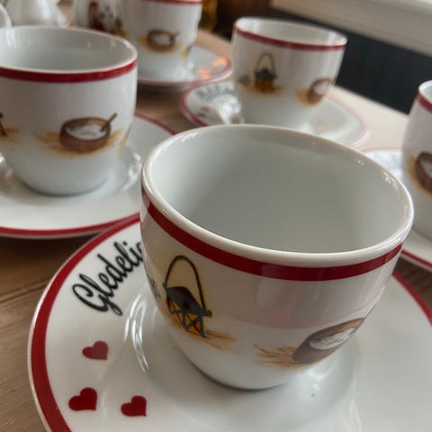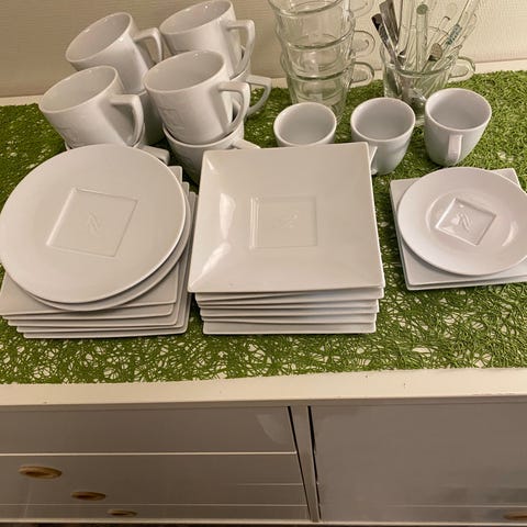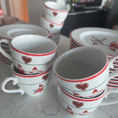 Pent brukt. Litt slitasje på den røde kanten på ene skåla. Ellers fine.