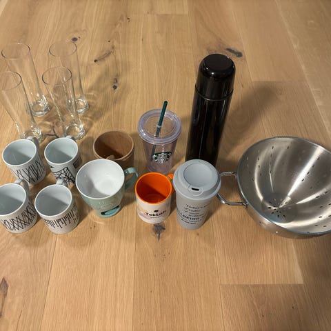 kjøkkenutstyr krus og tallerkener i blå og okergul