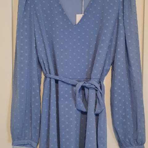 Nydelig blå kjole fra VILA, modell VIMALIANA V-neck L/S Bell Dress Petite, størrelse 44. Kjolen har et flatterende V-utringet snitt, lange ermer og et matchende belte som fremhever midjen. Skjørtet er plissert og gir et elegant og feminint uttrykk. Perfekt til både hverdags og festlige anledninger.