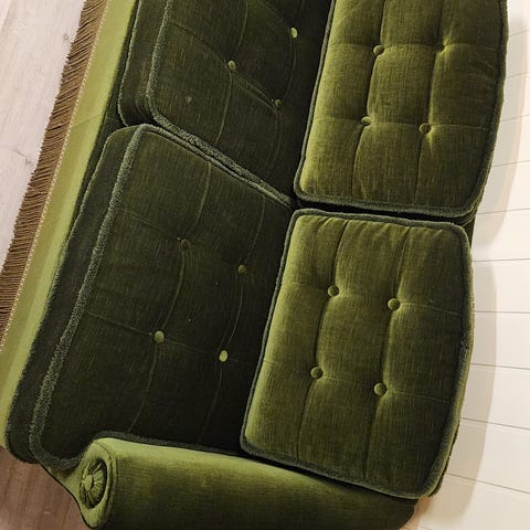 Retro sofa med 3 sitteplasser. Lys grønn farge. Med fjærer, ingen hull, kun noen små riper i stoffet fra katt. Sofaen er i veldig god stand. Lite brukt, har stått i gjesterommet i flere år. Konstruksjonen er hel og uskadd.