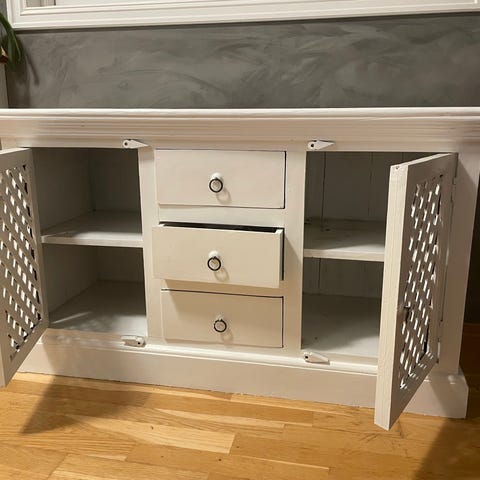 Godt brukt speil skjenk, hel og alle skuffer funker. Trenger et strøk maling ( er malt fra før, men trenger nå et nytt strøk)