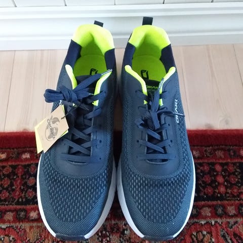 Okaki sko, SympaTex, i størrelse 46 med vanntett materiale. Skoene har en kombinasjon av grønt og brunt fargevalg. Selges da de dessverre er for store.