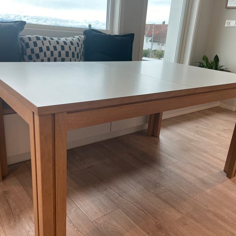 Skovby spisebord model Sm24 i heltre hvitoljet eik, lengde 200 cm. Inkludert tre ileggsplater i eikefiner som da gir en lengde på inntil 356 cm. Bordet er ca. 10 år gammelt. Har blitt oljet flere ganger - se derfor bilde 3 for riktig farge på bordet slik det fremstår nå. Noen synlige merker, men ingen dype riper eller skader. Kan besiktiges /hentes på Skåthaugen. Nypris ca. kr. 40.000.