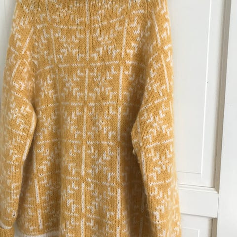 Genseren er strikket med utgangspunkt i Cloud blouse fra Petit knit, men avsluttet med I-cord på armer og bol i stedet for vrangbord. Den er også strikket lenger enn denne modellen fra Petit knit. Den er strikket ovenfra og ned med vendepinner for god passform.