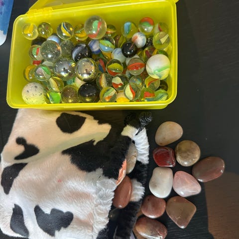 Samling av kuler i ulike størrelser og farger. Materialet er glass. Passer til lek og samling.