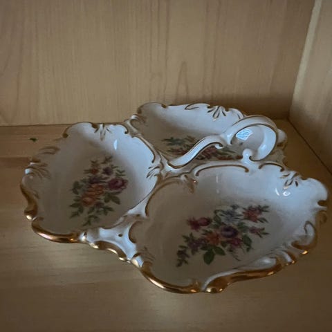 Servise sett i porselen med blomsterdekor. Inneholder flere tallerkener, suppeboller, serveringsfat og sausbolle. Hvert del har dekorative blomster og gullkant. Passer til bruk ved borddekking og servering. Fra Polen.