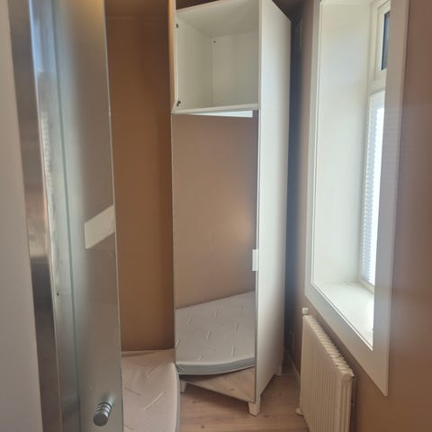 Skap gis bort da det ikke blir brukt. Det trengs å fikses, derfor bli det gitt bort. Den har kun en skuff nå. Det er også litt skeivt. Dette kan nok fikses. Veggen bak er løs og må også eventuelt fikses.