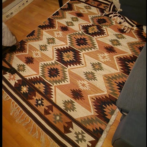 Meget fin Kymo-teppe selges for 6000 kroner.