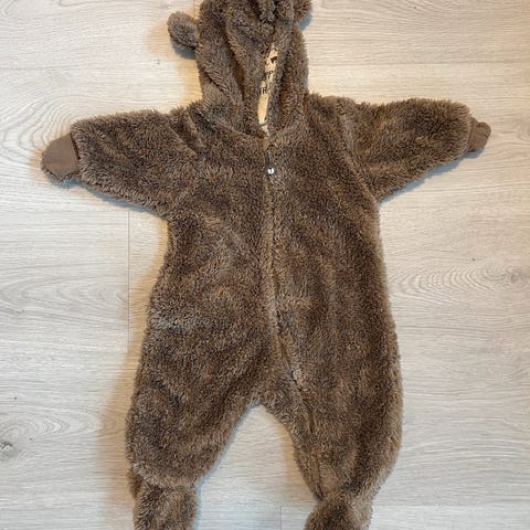 H&M brun babydress i størrelse 62, laget av bomull. Dressen er unisex og har hette med ører, samt integrerte votter. Den er god og varm og har passet for våre fra nyfødtstørrelse til ca 4 mnd.